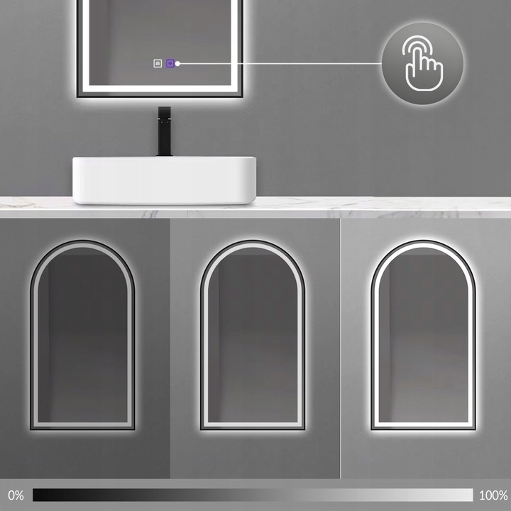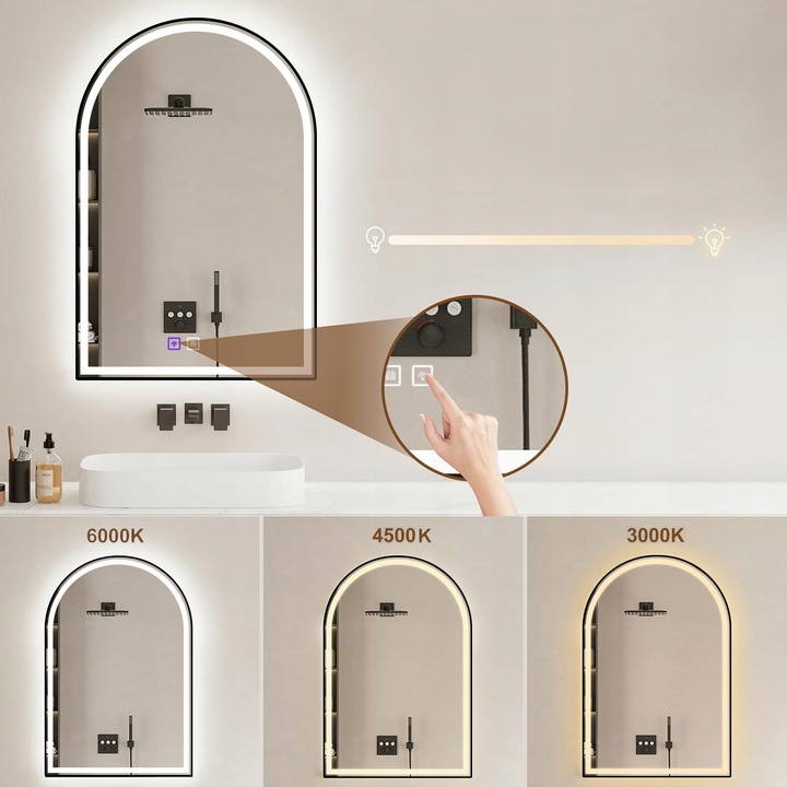 Dzięki dotykowemu przełącznikowi, lustro LED oferuje wygodną zmianę barwy światła oraz funkcję ściemniania, pozwalając precyzyjnie dopasować oświetlenie do każdej okazji i pory dnia. Dodatkowo, lustro zostało wyposażone w funkcję anti-fog, która zapobiega zaparowaniu.