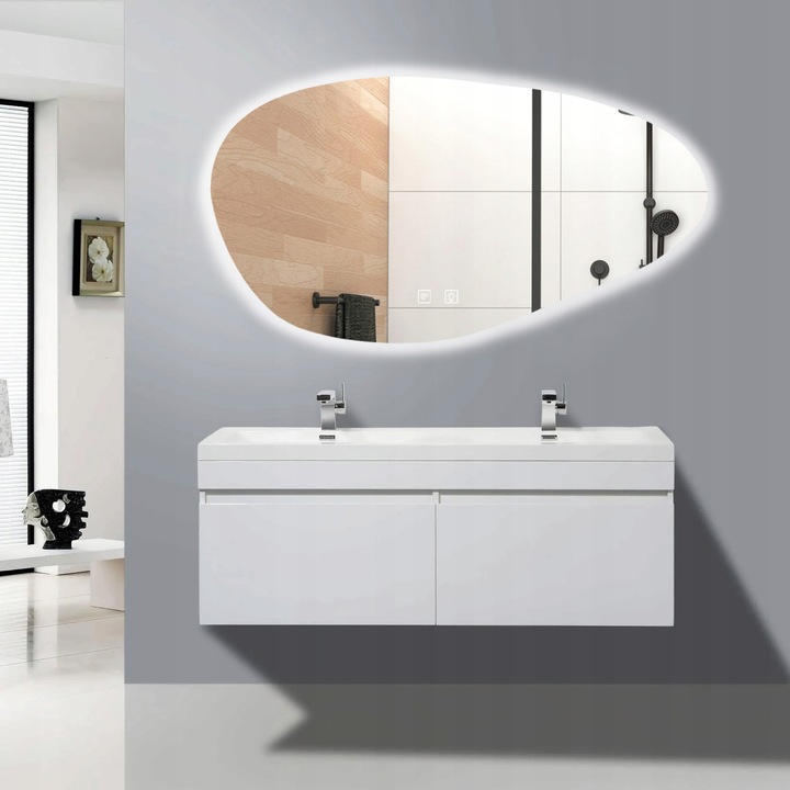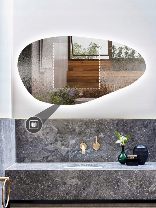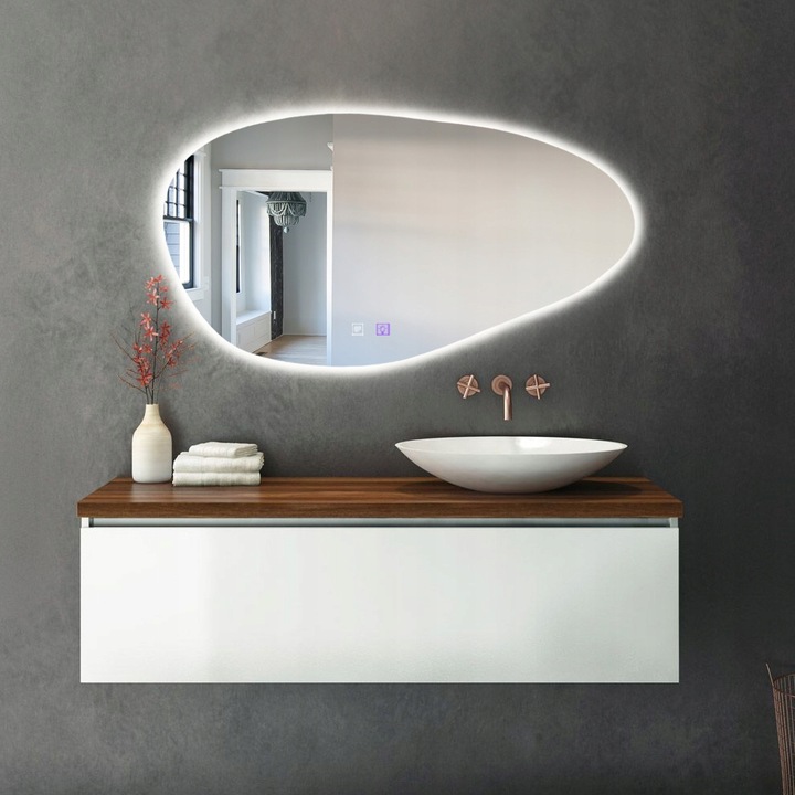 Lustro o nieregularnym kształcie posiada do wyboru trzy zmieniane dotykowo barwy światła Led – ciepła, neutralną i zimną oraz funkcję podgrzewania zapobiegającą zaparowaniu powierzchni.