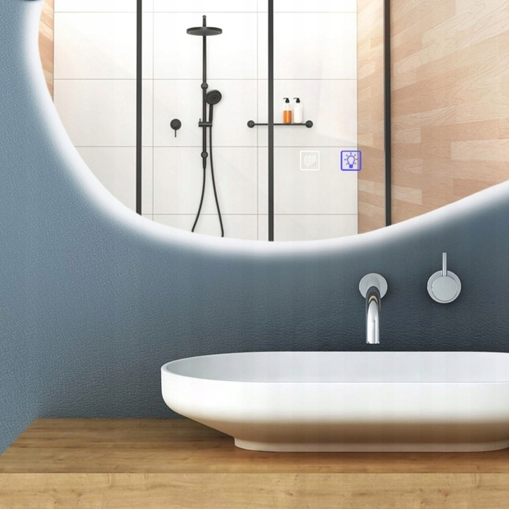 Prostym gest palcem we wskazanym miejscu pozwala swobodnie dostosować jasność światła do konkretnych potrzeb. Dodatkowo, podświetlony przełącznik dotykowy na tafli lustra, świecący na niebiesko, stanowi praktyczny wskaźnik aktywności funkcji, ułatwiając obsługę.